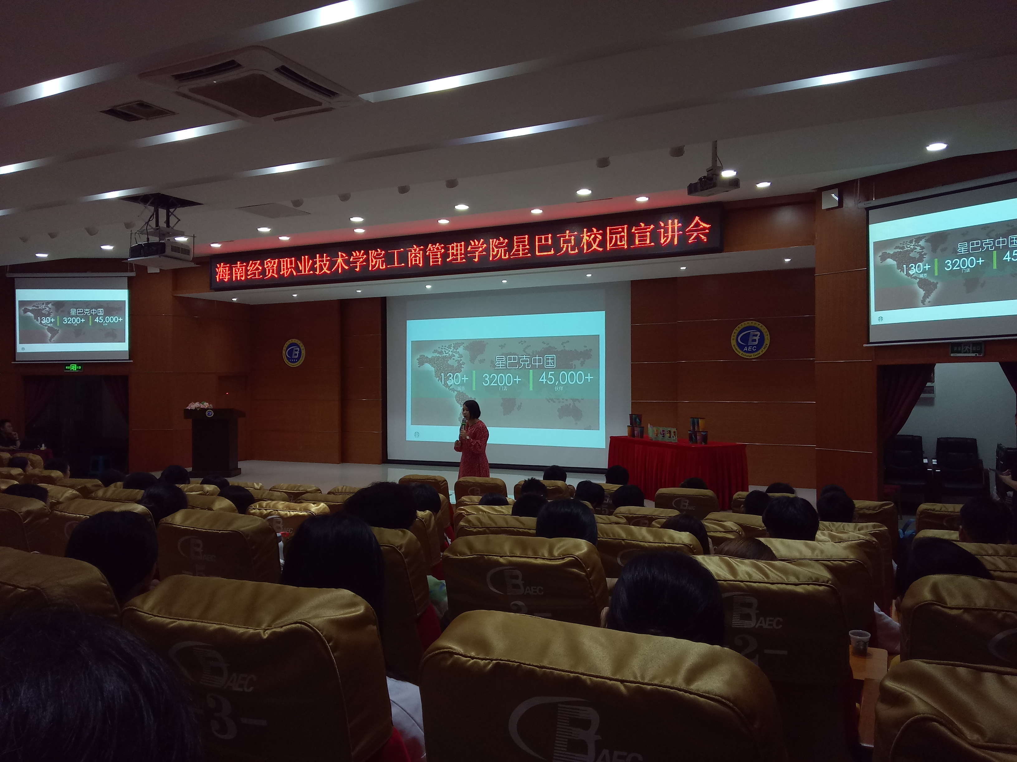 为加强校企合作,加强学生的职业素养和就业能力。工商管理学院于6月11日19:00-20:20在学术交流中心举行了星巴克校园宣讲会。出席本次招聘会的有星巴克海南区域经理韩钰杉和海口各门店经理,2017级市场营销、物流管理和连锁经营管理专业300人参加,学院团总支负责人王子前老师致欢迎词。