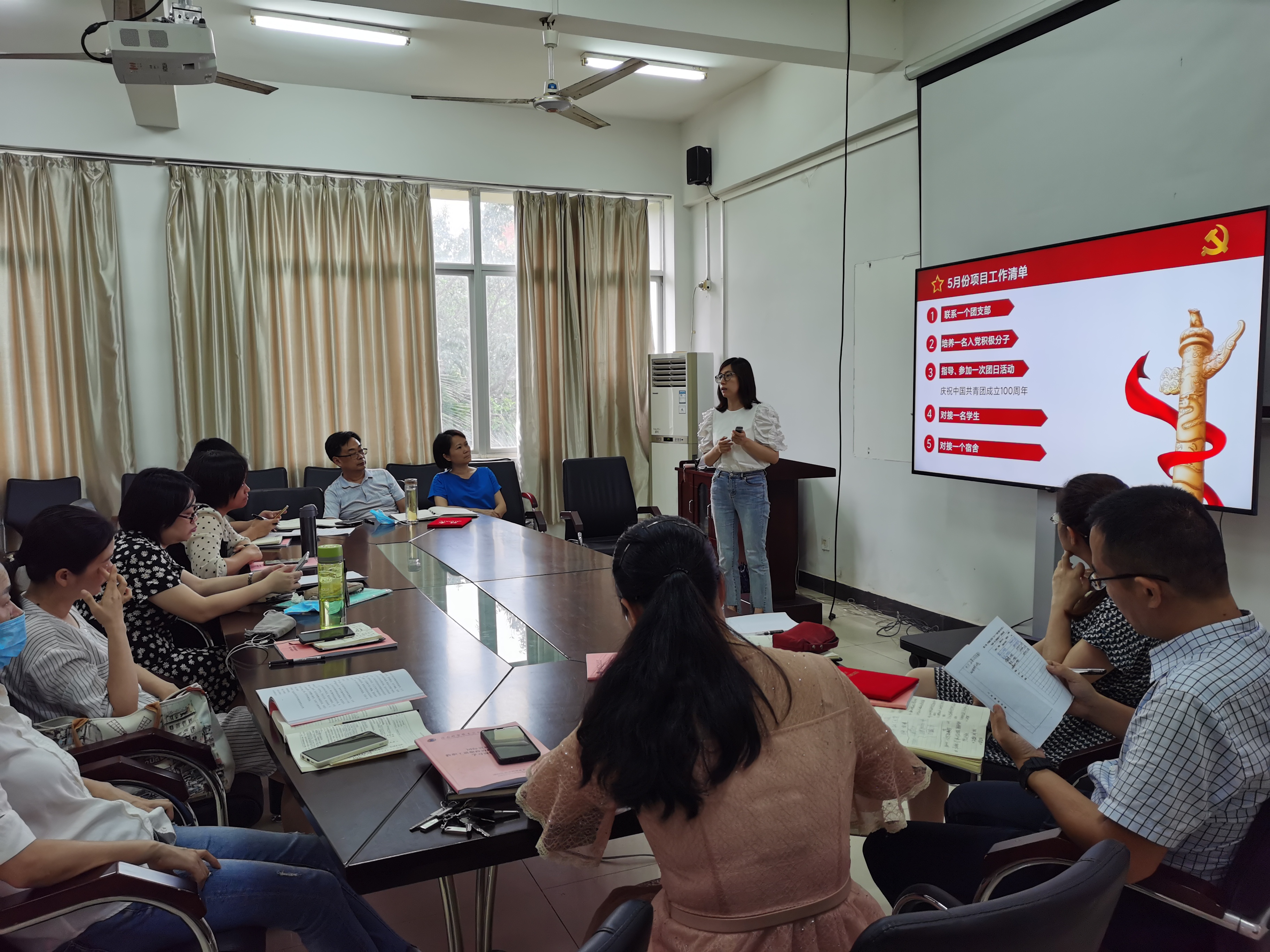 学生党支部书记王子前分享习近平总书记的重要讲话的要点和金句摘录。行政党支部书记赵爽指出,要加快推进“五个一”先锋工程建设,5月份通过主题团日活动带领广大团员深刻学习领会习近平总书记建团100周年重要讲话精神,党员教师要自觉担当尽责,践行为党育人使命。