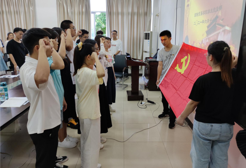 下午,我院党总支书记黄邦姬为毕业学生党员及在校学生党员、入党积极分子、发展对象上了一堂“不忘初心 方可一往无前 ”党史学习教育专题党课。党课上,黄邦姬引领全体党员重温嘉兴南湖的红船故事,梳理了小小嘉兴南湖红船承载的重大成果和重大意义,引导全体党员深入学习习总书记的嘉兴南湖讲话精神,并向党员强调:唯有不忘初心,牢记使命,方可一往无前。黄邦姬着重强调三大红船精神,强调红船精神是我们启航新时代的强大精神动力。党课后,新一批预备党员同志面向鲜艳的党旗,举起右手庄严宣誓,表情坚定,声音洪亮,将党员们牢记党的宗旨、争做合格接班人的决心表现得淋漓尽致。