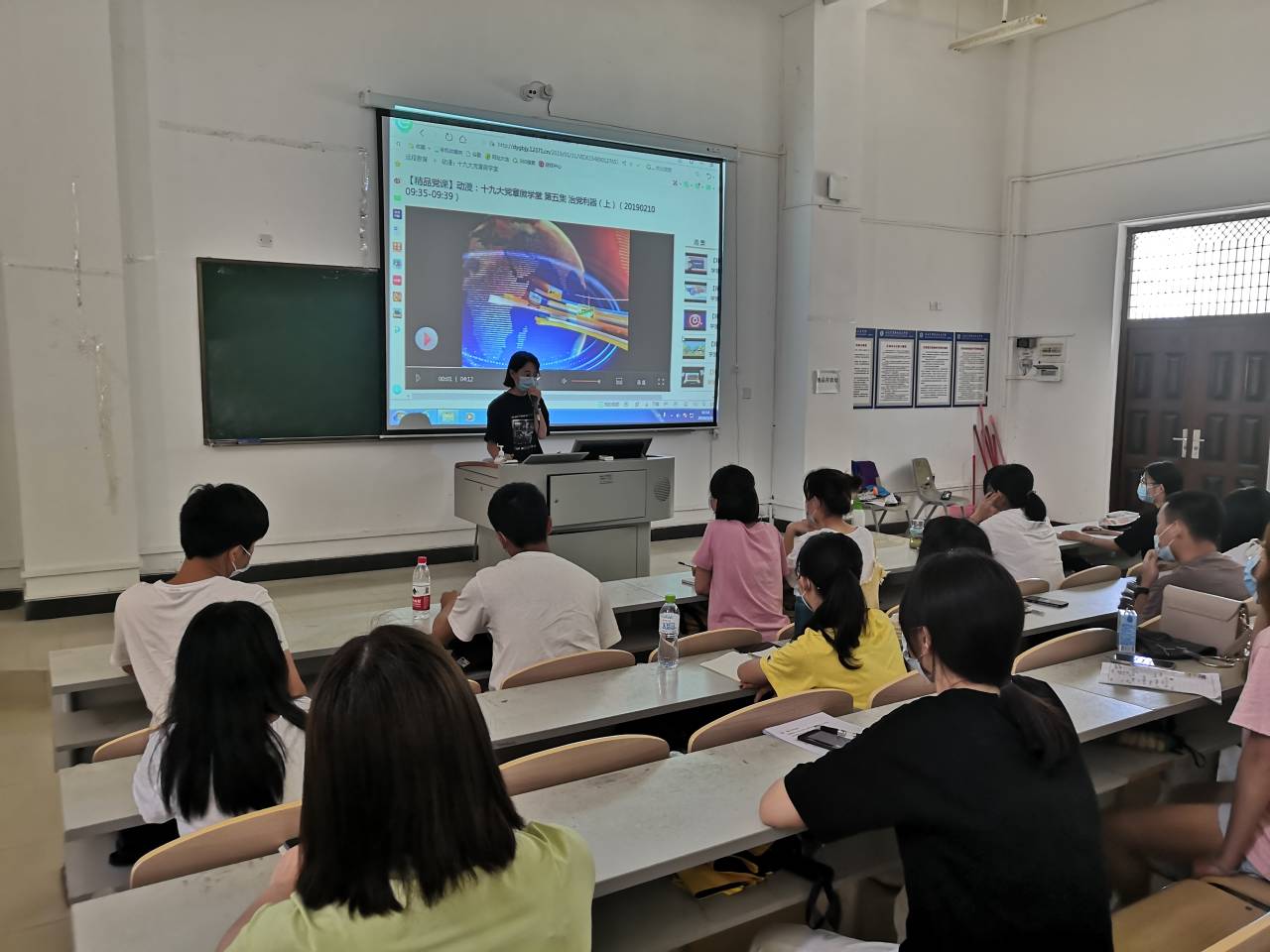 结合疫情现状,为避免大范围人群聚集,同时照顾未返校人员,此次培训由线上、线下同时开展,实施隔位落座,全程佩戴口罩。线上主要基于APP进行学习,通过自主学习的方式完成党课培训;线下主要由观看视频、讲座以及讨论进行。在培训开展前,支部宣传委员刘焱同志强调培训纪律,希望每位学员一是要提高政治站位,把学习贯彻十九届四中全会精神作为首要政治任务抓紧抓好。二是要准确定位,发挥先锋模范带头作用。三是要以提高综合素养为目标,做到知行合一。学生党员培训代表陈欣同志作了动员讲话,一是希望各位学员进一步提高认识,端正学习态度,务求学习实效,在深入学习中加强党性修养;二是注重以习近平新时代中国特色社会主义思想和党的十九大精神武装头脑,坚定理想信念,以党员的标准严格要求自己,争取早日加入中国共产党。三是希望各位学员加强党性锻炼,在卓有成效的学习和工作中担当责任,严格要求自己,时时处处发挥模范带头作用。