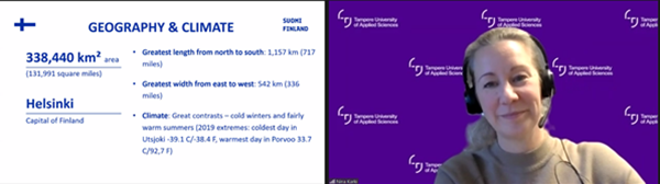 在简短的开班仪式后,坦佩雷应用科技大学Nina Kärki女士进行了本次线上活动的首次授课。Nina Kärki为学生们展示了芬兰语言和文化特色,结合课件让学生们身临其境地感受异国文化的魅力,并耐心解答了同学们提出的问题。