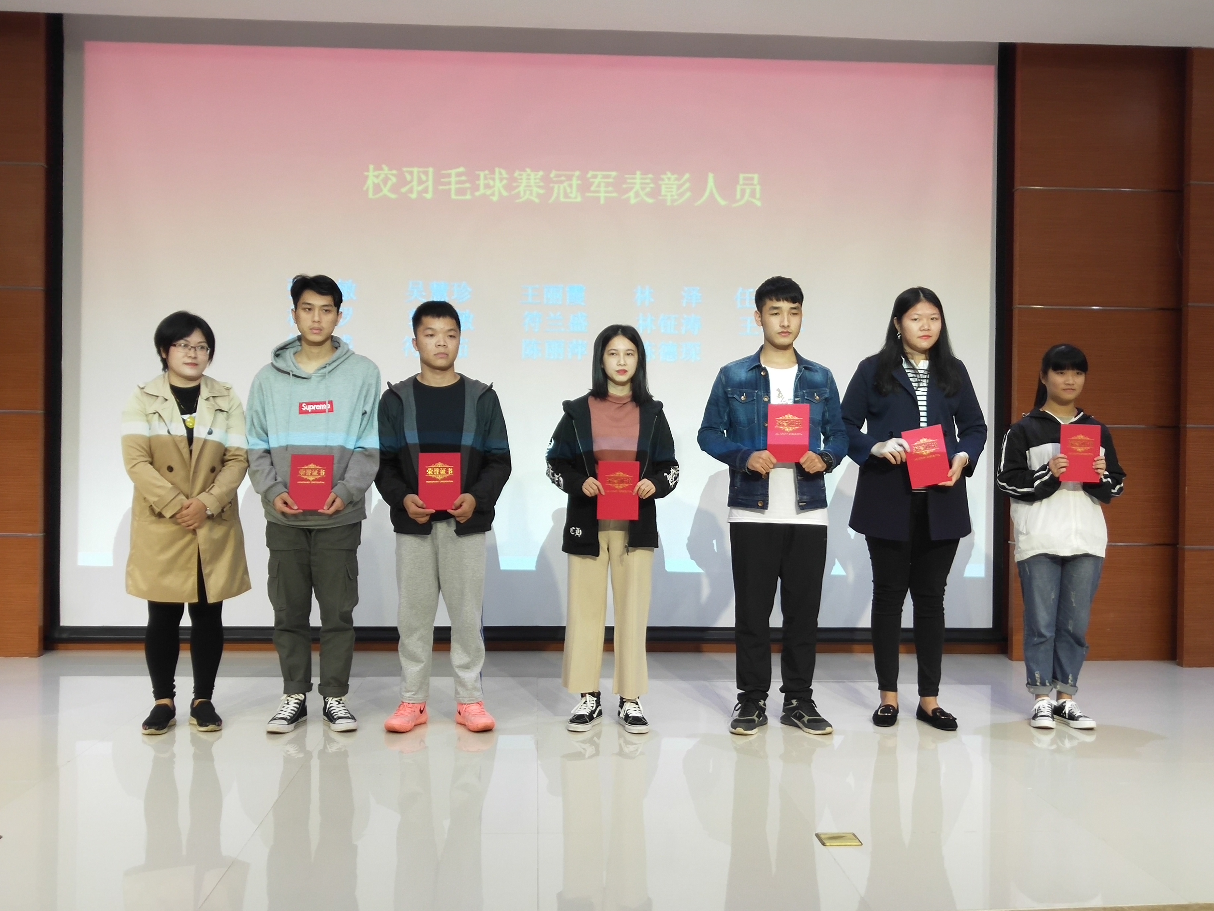 大会在嘹亮的国歌声中拉开帷幕,院学工办主任赵志凌老师宣读表彰决定,并对他们表示衷心的祝贺。随后由优秀运动员代表冯行宣和学生干部代表符惠菲代表发言,他们表示将在今后的生活将体育精神继续发扬,与学院同发展,为学院再创佳绩。参会老师分别为2018年校“迎新杯”篮球赛冠军、校第六届男子校园足球赛冠军、校第七届校运会羽毛球赛小牧冠军和第七届运动会优秀运动员颁发荣誉证书,进行合影留念。最后由学院党总支蒙永坚书记作总结发言,蒙书记在讲话中希望同学们要坚持体育锻炼保持良好的体魄,对工管学子寄予厚望,希望在今后的学习和活动中再创佳绩。