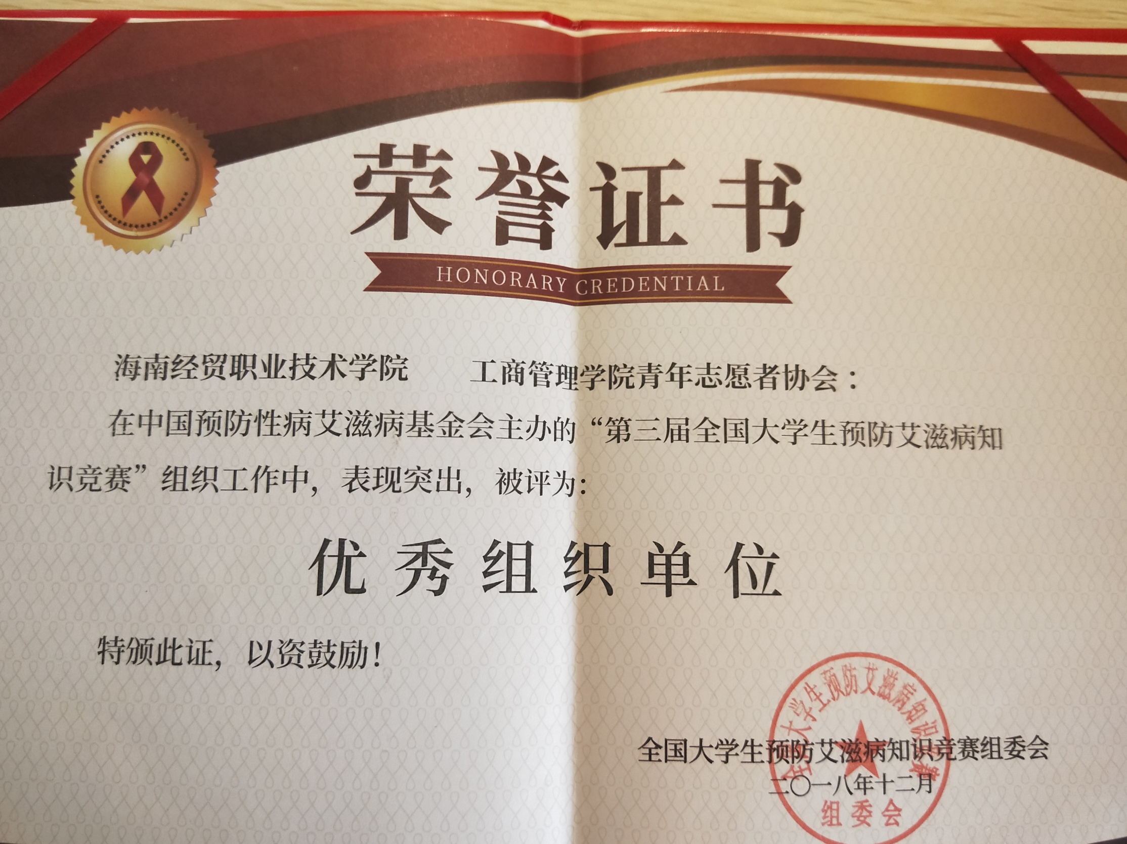 2019年3月5日讯(工商管理学院报道)近日,海南经贸职业技术学院工商管理学院青年志愿者协会在第三届全国大学生预防艾滋病知识竞赛中表现突出,被评为“优秀组织单位”,3名参赛同学获得“优秀组织者”,5名参赛同学获得“优秀志愿者”称号,徐翊缤老师“优秀指导老师”称号。