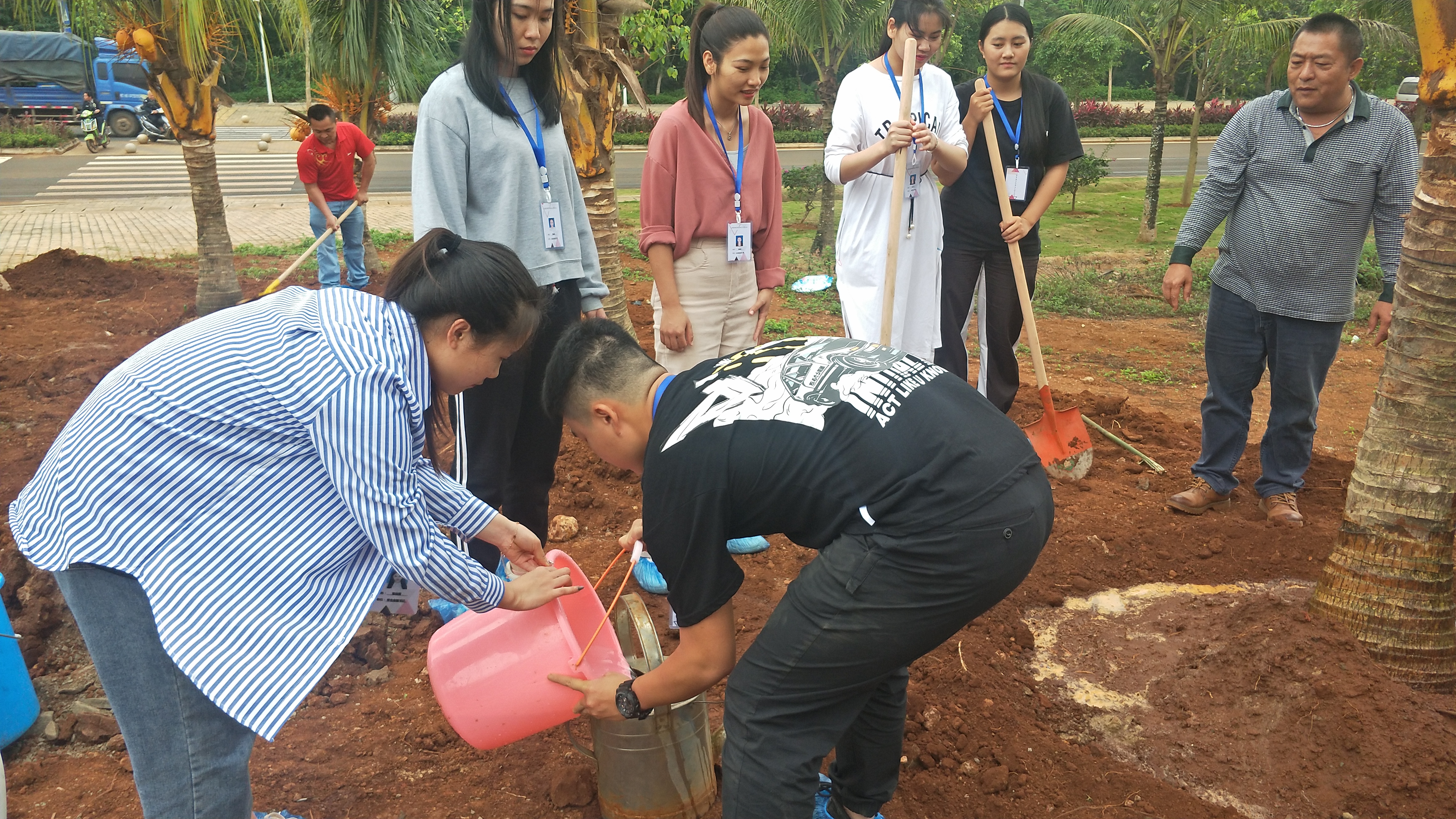 活动过程中,每个人都有明确的分工,有的用铲子松土挖坑,有的往里种树苗,有的结伴去浇水。老师们更是亲力亲为,卷起袖子,不怕苦不怕累,拿起锄头亲自给树苗松土,提水给椰树浇水,经过了近一个小时的共同努力,校园东门绿色盎然。本次活动充分体现了老师与同学们同甘共苦、辛勤建设美好校园的精神,对习总书记提出的“建立生态文明的意识和观念”有着较强的促进作用。