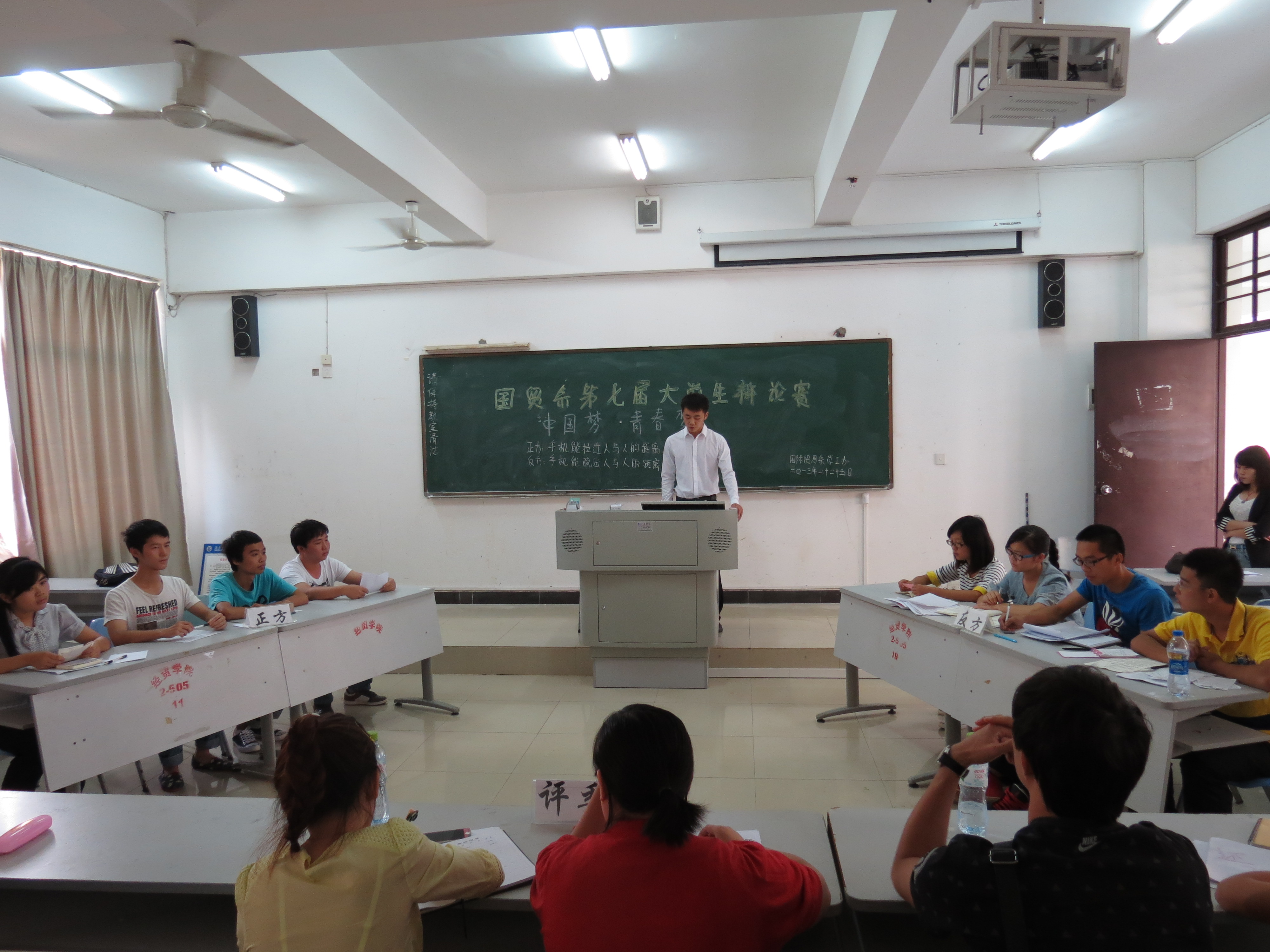 本次辩论赛以“手机拉近还是疏远人与人之间的距离”为辩题,比赛由2013级五个班级组成的六支参赛队伍参加,分为3场依次进行。比赛进行过程中,辩手们旁征博引妙语连珠。双方针锋相对互不相让,为大家奉献了一场有理有据的精彩辩论。经过立论陈词、攻辩阶段、攻辩小结和总结陈词四个环节环环紧扣。近2小时的激战,最终姚宁等6名同学以其个人突出的表现获得了“最佳辩手”称号。最后2012级陈姣老师为本次辩论赛作了点评,陈老师对本次辩论赛和场上辩手的活跃表现给予了肯定,同时也提出了希望改进的不足之处。同学们受益匪浅。