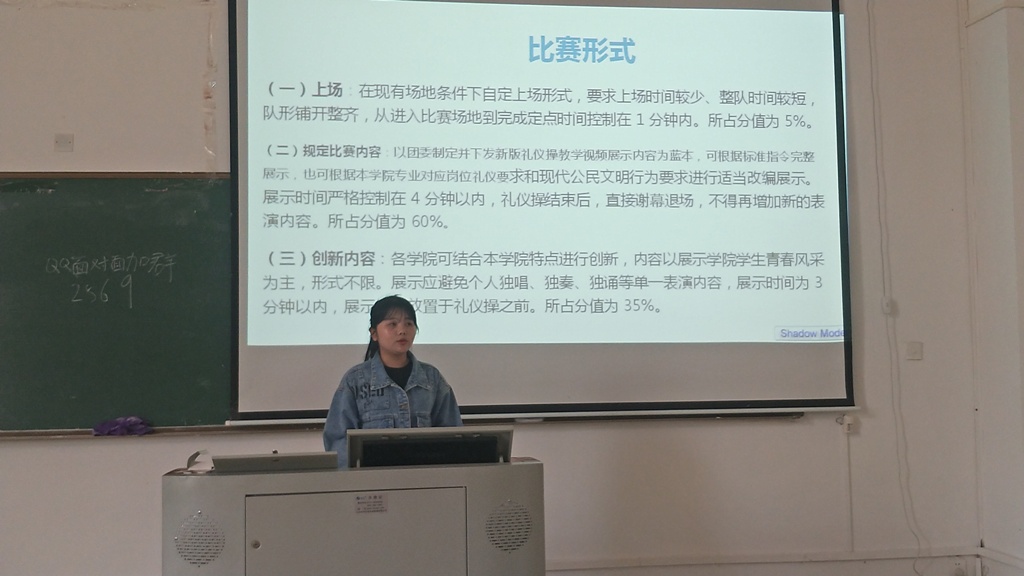 动员会共有三项,第一项由文艺部部长杨舒婷向18级的同学介绍了校礼仪操和院礼仪操的举办时间地点、学习礼仪操的要求。