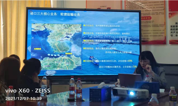 首先由庄经理对海口港的发展与运营做了个整体介绍,同学们初步了解了海口港航控股有限的业务范围、战略定位以及未来发展策略。