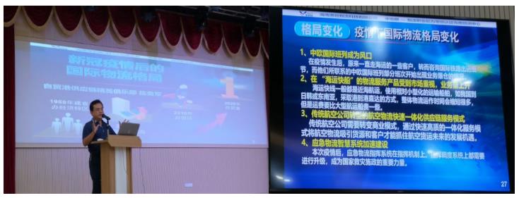 在“新冠疫情后的国际物流格局”讲座中,陈博士从供应链角度解释了新冠疫情引发的国际产业转移及生产方式变革导致了国际物流格局的变化,拓展了学生的视野、激发了学生对本专业未来的思考。