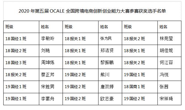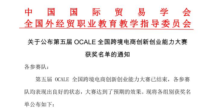 2020年6月18日,由中国国际贸易学会、全国外经贸职业教育教学指导委员会主办,南京世格软件有限公司承办的第五届OCALE全国跨境电商创新创业能力大赛正式落下帷幕。本次比赛吸引了全国23个省份的203所院校,639支队伍,共计1914名选手参加。经过激烈角逐,我校工商管理学院的代表队获得了团体三等奖的好成绩。