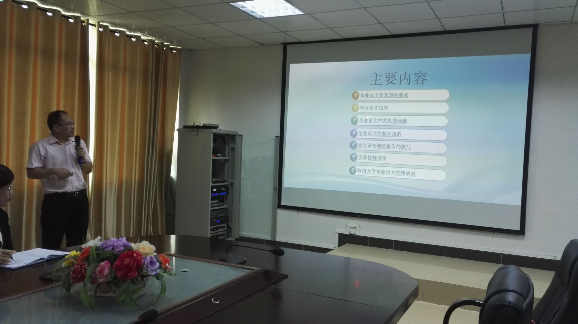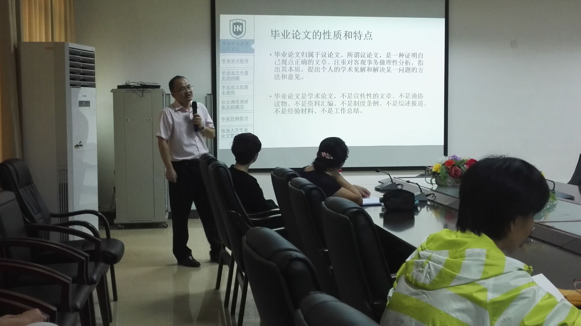 接着刘家诚教授通过海南大学本科毕业论文的实例,向我院老师介绍了指导毕业论文需要关注的问题。刘教授主要从“毕业论文及其写作要求、毕业论文指导、毕业论文中常见的问题、毕业论文的基本规范、社会调查调研报告的撰写、毕业答辩指导、海南大学毕业论文管理规范”等七个方面详细讲解了毕业论文指导工作的各项要求,使在场教师受益匪浅,也为顺利完成我校第一届4+0本科毕业生的毕业工作奠定了基础。