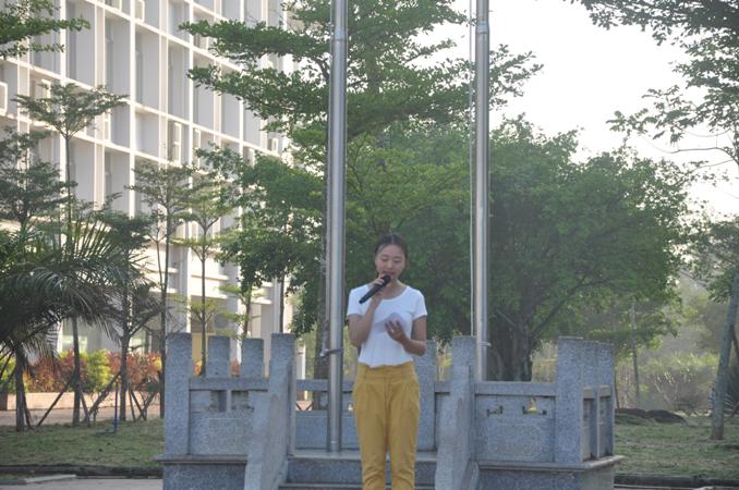 升旗仪式结束后,学生代表林晨进行国旗下讲话,她所演讲的《我眼中的祖国》不仅仅表达出了一个当代大学生对祖国的热爱,更充分表达出了他们这一代人对祖国未来建设的坚定和决心。