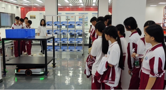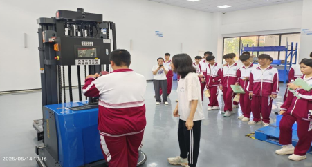 海南省商业学校学生在观摩AGV设备的运行