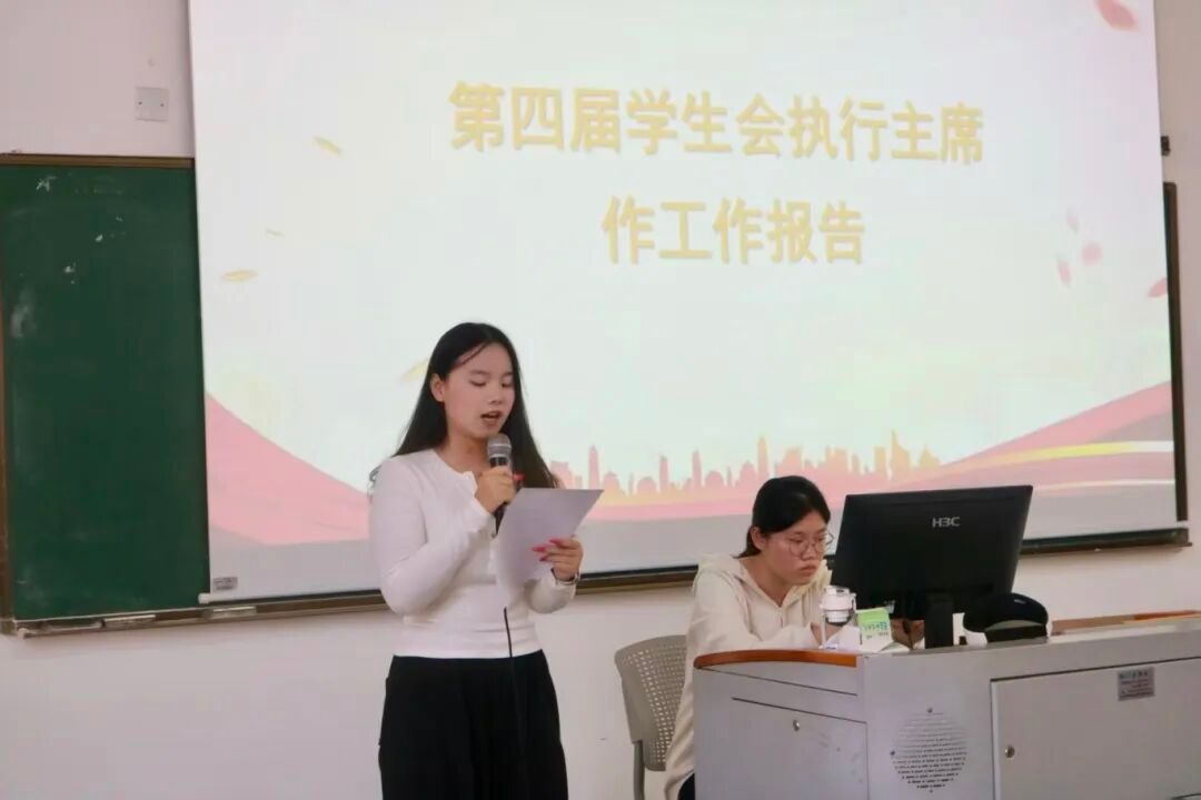 大会在庄严的国歌声中拉开帷幕。党总支副书记梁其钰充分肯定了过去工作,并强调学生组织要继续发挥桥梁纽带作用,服务同学成长,助力学院发展。学生会执行主席吴芷涵同学代表上一届学生会系统报告了2024-2025年度的工作成果与不足,为后续工作提供了参考。
