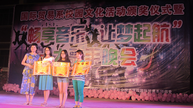 本场晚会由“校园文化活动颁奖仪式”与“国贸系十佳歌手赛总决赛”两个篇章进行。在颁奖环节邀请徐畅副书记等领导为获奖的个人和获奖班级、团学部门分别颁发了:“教室文化创设奖”、“争当读书之星奖”、“读一本好书,读后感个人优异奖”、“最佳课堂纪律组织奖”、“我的中国梦 文明宿舍评比奖”、“团总支学生会先进个人与先进部门奖”等六个奖项,以此来肯定与鼓励更多的同学与班级加入到校园文化活动中来。